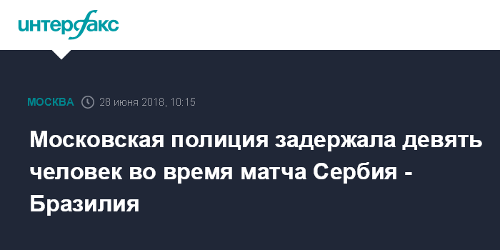 Москва. 28 июня. INTERFAX.RU -Девять человек были задержаны полицией за нарушения общественного порядка во время футбольного матча между командами Сербии и Бразилии, прошедшего накануне в Москве, сообщил "Интерфаксу" в четверг осведомленный источник.