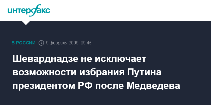 Москва. 9 февраля. INTERFAX.RU - Экс-министр иностранных дел Советского Союза, бывший президент Грузии Эдуард Шеварднадзе предполагает, что премьер-министр России Владимир Путин может снова стать главой российского государства.