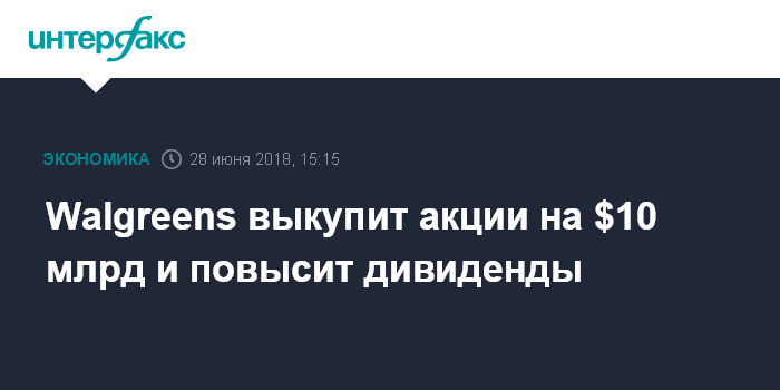 Москва. 28 июня. INTERFAX.RU - Американская аптечная сеть Walgreens Boots Alliance утвердила программу выкупа акций объемом $10 млрд, а также объявила о 10%-ном увеличении квартальных дивидендов после сильных результатов третьего финансового квартала.