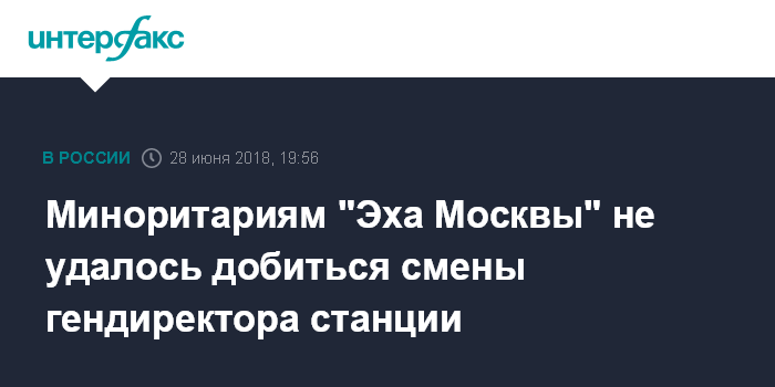 Москва. 28 июня. INTERFAX.RU - Миноритарии "Эхо Москвы" на собрании акционеров после представления годового отчета поставили вопрос о снятии с должности генерального директора радиостанции Екатерины Павловой, но не получили поддержки основного владельца.