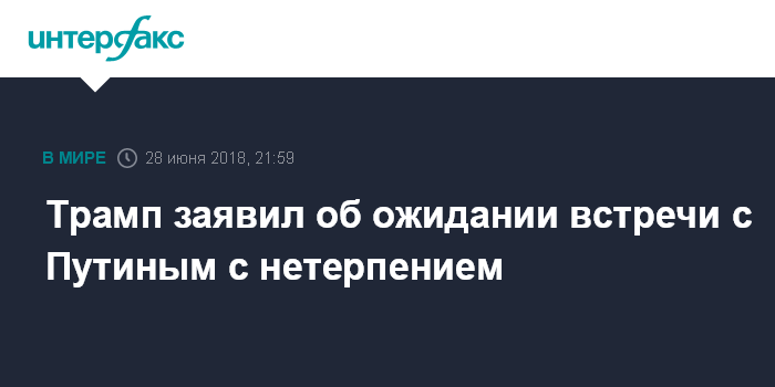 Москва. 28 июня. INTERFAX.RU - Президент США Дональд Трамп заявил, что ожидает с нетерпением встречу с российским коллегой Владимиром Путиным в Хельсинки, сообщают в четверг американские СМИ.