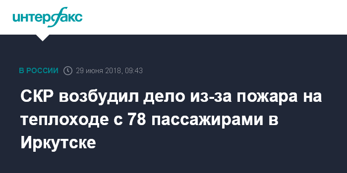 Москва. 29 июня. INTERFAX.RU - Уголовное дело возбуждено из-за возгорания на теплоходе "Баргузин" Восточно-Сибирского речного пароходства (ВСРП) с 78 пассажирами на борту, сообщили агентству "Интерфакс" в Восточно-Сибирском следственном управлении на транспорте СКР.
