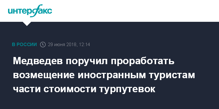 Москва. 29 июня. INTERFAX.RU - Премьер-министр РФ Дмитрий Медведев поручил федеральным органам исполнительной власти проработать вопрос компенсаций части стоимости турпутевки для иностранных туристов для стимулирования въездного турпотока.