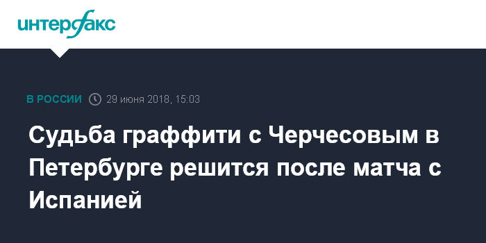 Москва. 29 июня. INTERFAX.RU - Власти северной столицы отложили решение о судьбе граффити с тренером футбольной сборной РФ Станиславом Черчесовым еще на неделю, следует из сообщения, опубликованного в пятницу на портале Смольного "Наш Санкт-Петербург".