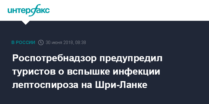 Москва. 30 июня. INTERFAX.RU - Роспотребнадзор призвал российских туристов при планировании зарубежных поездок учитывать информацию о росте числа случаев заболевания лептоспирозом на территории Шри-Ланки, говорится в сообщении, опубликованном в субботу на сайте ведомства.