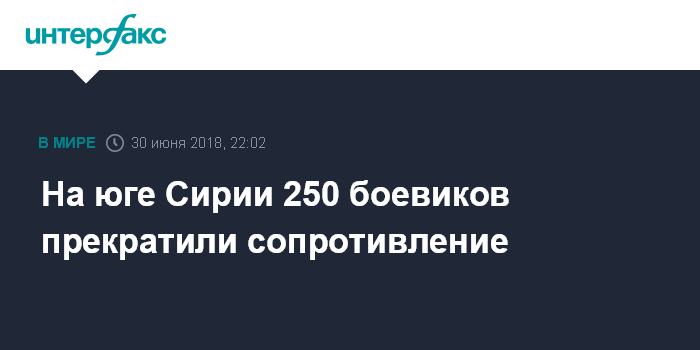 Москва. 30 июня. INTERFAX.RU - Боевики в количестве 250 человек в Юго-Западной зоне деэскалации в Сирии прекратили сопротивление правительственным силам и согласились урегулировать свой статус, сообщил на брифинге начальник российского Центра по примирению враждующих сторон в Сирийской Арабской Республике генерал-майор Алексей Цыганков.