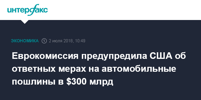 Москва. 2 июля. INTERFAX.RU - Штрафные пошлины США на импорт автомобилей могут повлечь за собой ответные меры по всему миру, которые затронут американские товары на сумму до $300 млрд, говорится в письме Европейской комиссии американскому министерству торговли. Документ оказался в распоряжении The Financial Times.