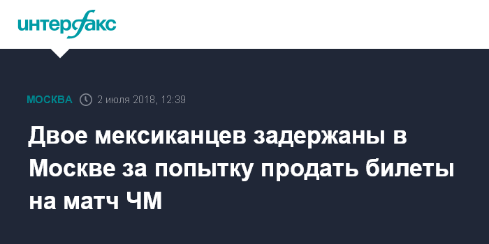 "Двое мексиканских болельщиков были задержаны полицией на Хамовническом валу. Мужчины пытались продать входные билеты на матч между сборными командами Испании и России за $245", - сказал собеседник агентства.