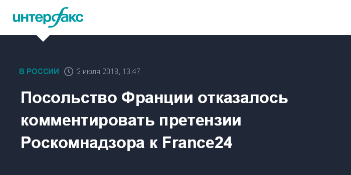 Москва. 2 июля. INTERFAX.RU - Посольство Франции не комментирует ситуацию относительно претензий Роскомнадзора в адрес учредителя телеканала France 24 в России.