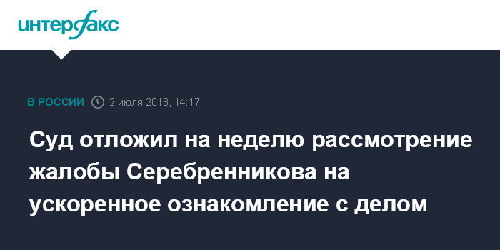 Москва. 2 июля. INTERFAX.RU - Мосгорсуд через неделю продолжит рассмотрение апелляционной жалобы на ограничение художественного руководителя "Гоголь-центра", режиссера Кирилла Серебренникова в сроке ознакомления с материалами уголовного дела, передает корреспондент "Интерфакса".