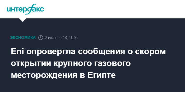 Москва. 2 июля. INTERFAX.RU - Итальянский нефтегазовый концерн Eni опроверг информацию о готовящихся новых крупных открытиях углеводородного сырья в Египте. Об этом сообщает арабская служба CNBC со ссылкой на заявление руководства компании.