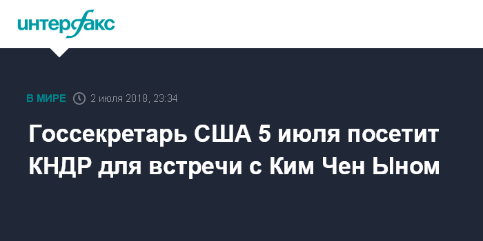 Москва. 2 июля. INTERFAX.RU - Госсекретарь США Майк Помпео вылетит 5 июля в КНДР, чтобы встретиться с северокорейским лидером Ким Чен Ыном, сообщила пресс-секретарь Белого Дома Сара Сандерс.