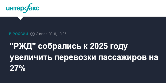 Москва. 3 июля. INTERFAX.RU - ОАО "Российские железные дороги" (РЖД) рассчитывает к 2025 году увеличить перевозки пассажиров по сравнению с 2017 годом на 27%, до 1,4 млрд человек, пишет во вторник газета "Ведомости" со ссылкой на материалы компании.