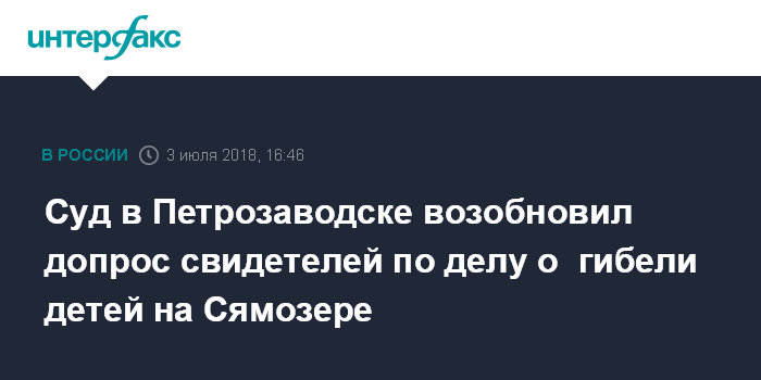 Москва. 3 июля. INTERFAX.RU - Петрозаводский городской суд во вторник возобновил рассмотрение дела о гибели детей на Сямозере, в настоящее время идет допрос свидетелей, сообщили "Интерфаксу" в суде.