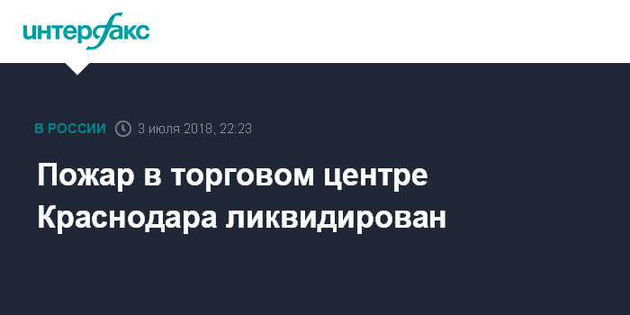 Москва. 3 июля. INTERFAX.RU - Пожар, вспыхнувший во вторник на складе торгового центра в Краснодаре, полностью ликвидирован, сообщили агентству "Интерфакс-Юг" в пресс-службе Главного управления МЧС России по Краснодарскому краю.