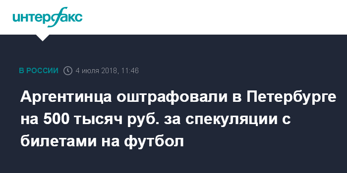 Москва. 4 июля. INTERFAX.RU - Мировой суд Петербурга привлёк к административной ответственности гражданина Аргентины за незаконную продажу билетов на матчи чемпионата мира по футболу - 2018, сообщили в объединенной пресс-службе судов города в среду.