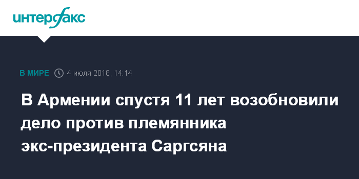 Москва. 4 июля. INTERFAX.RU - Генеральная прокуратура Армении возобновила производство уголовного дела по статье "покушение на убийство", фигурантом которого стал сын брата бывшего президента Армении Сержа Саргсяна - Айк Саргсян.