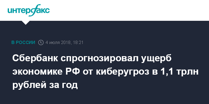 Москва. 4 июля. INTERFAX.RU - Ущерб российской экономике от киберугроз в 2018 году может составить 1,1 трлн рублей, сообщил зампред правления Сбербанка России Станислав Кузнецов на пресс-конференции в среду.