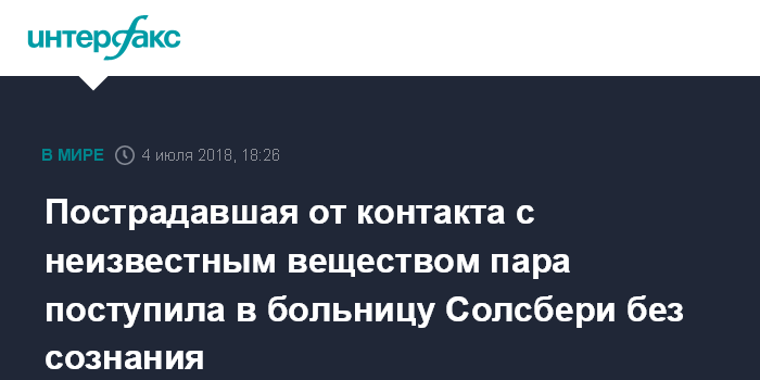 Москва. 4 июля. INTERFAX.RU - Пострадавшие от контакта с неизвестным веществом в британском населенном пункте Эймсбери (графство Уилтшир) поступили в больницу Солсбери в бессознательном состоянии и с пеной изо рта, пишет в среду британская The Sun.
