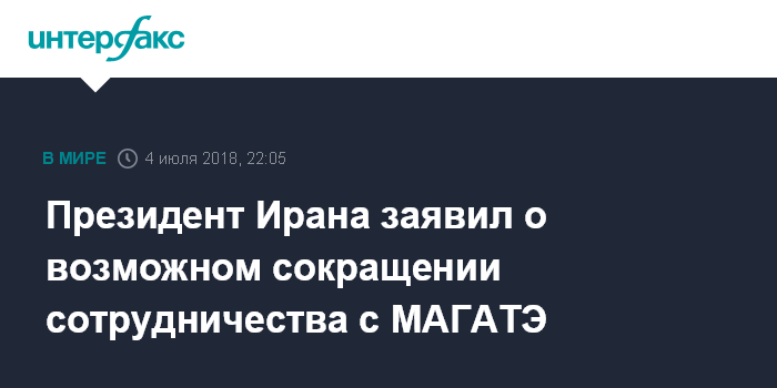 Москва. 4 июля. INTERFAX.RU - Президент Ирана Хасан Рухани после встречи с гендиректором Международного агентства по атомной энергии (МАГАТЭ) Юкией Амано заявил, что после выхода США из соглашения по иранской ядерной программе Тегеран может пойти на снижение масштабов сотрудничества с этой организацией.