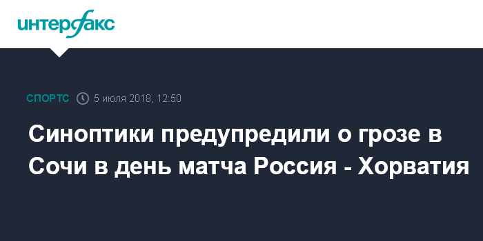 Москва. 5 июля. INTERFAX.RU - Гроза пройдет в Сочи 7 июля незадолго до вечернего матча сборных России и Хорватии 1/4 финала Чемпионата мира по футболу, во время игры ожидается 20-22 градусов.