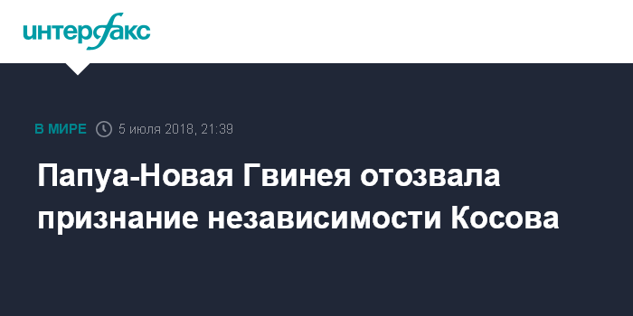 Москва. 5 июля. INTERFAX.RU - Папуа-Новая Гвинея отозвала признание независимости сербского автономного края Косово и Метохии. Об этом сообщил журналистам в четверг глава МИД Сербии Ивица Дачич.