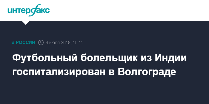 Москва. 6 июля. INTERFAX.RU - Футбольный болельщик из Индии госпитализирован в Волгограде, сообщили агентству "Интерфакс" в региональном комитете здравоохранения в пятницу.