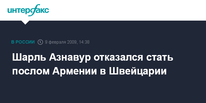 Москва. 9 февраля. INTERFAX.RU - Французский шансонье армянского происхождения Шарль Азнавур отказался стать послом Армении в Швейцарии.
