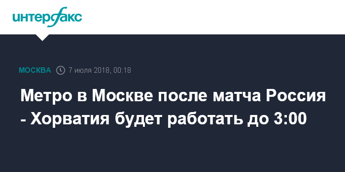 Москва. 7 июля. INTERFAX.RU - В ночь на 8 июля, после матча 1/4 финала Чемпионата мира по футболу между сборными России и Хорватии, который начнется в 21:00 в Сочи на стадионе "Фишт", столичное метро и Московское центральное кольцо продлят работу на два часа - до 03:00, сообщили "Интерфаксу" в пресс-службе столичного департамента транспорта.