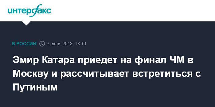 Москва. 7 июля. INTERFAX.RU - Эмир Катара шейх Тамим бен Хамад Аль Тани, как ожидается, посетит Москву к финалу чемпионата мира по футболу, рассчитывает встретиться с президентом РФ Владимиром Путиным, заявил посол Катара в Москве Фахад Мухаммед аль-Аттыйя.