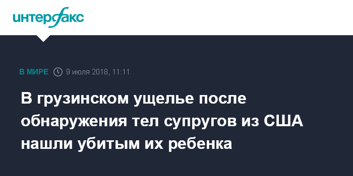 Москва. 9 июля. INTERFAX.RU - Четырехлетний ребенок четы из США, которого несколько дней искали в ущелье Хада в грузинском регионе Мцхета-Мтианети, найден мертвым, предполагается, что было совершено убийство, сообщил в понедельник Первому каналу Общественного вещателя Грузии глава районной администрации Душети Зураб Сехниашвили.