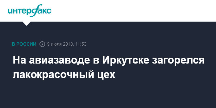Москва. 9 июля. INTERFAX.RU - Один из цехов площадью 4 тысячи квадратных метров загорелся на Иркутском авиационный заводе корпорации "Иркут". Об этом сообщили "Интерфаксу" в региональном главке МЧС РФ.