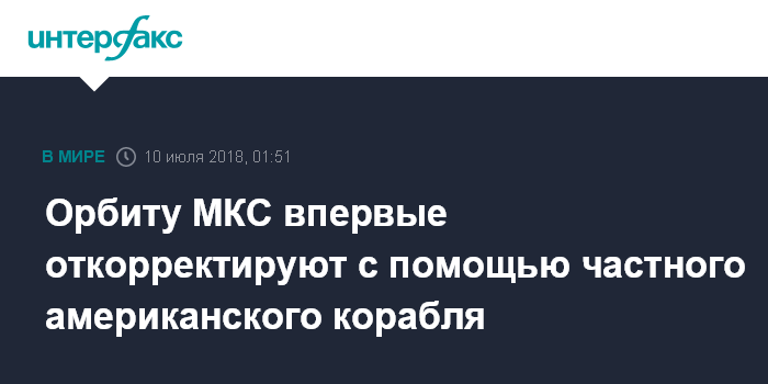 Москва. 10 июля. INTERFAX.RU - Частный американский космический грузовик во вторник впервые в истории "приподнимет" орбиту Международной космической станции, сообщил "Интерфаксу" источник в ракетно-космической отрасли.