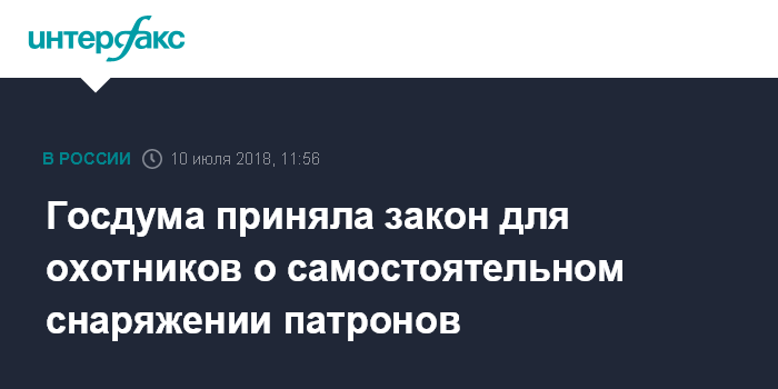 Москва. 10 июля. INTERFAX.RU - Госдума приняла в третьем, окончательном чтении закон о предоставлении права гражданам, имеющим разрешение на хранение и ношение огнестрельного длинноствольного оружия, производить самостоятельное снаряжение патронов к нему.