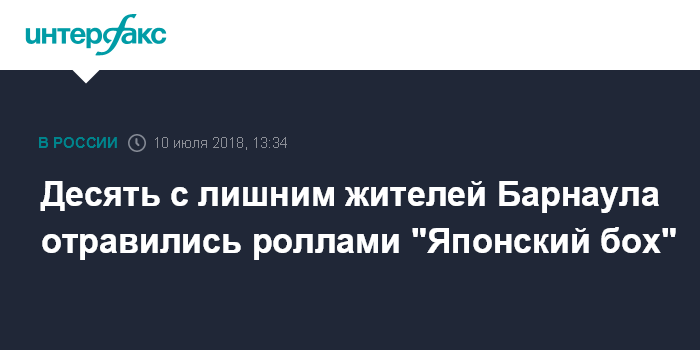 Москва. 10 июля. INTERFAX.RU - Девять жителей Барнаула госпитализированы с инфекцией после употребления роллов, заказанных в службе доставки японской еды, еще несколько человек проходят лечение амбулаторно, сообщили во вторник в региональном управлении Роспотребнадзора РФ.