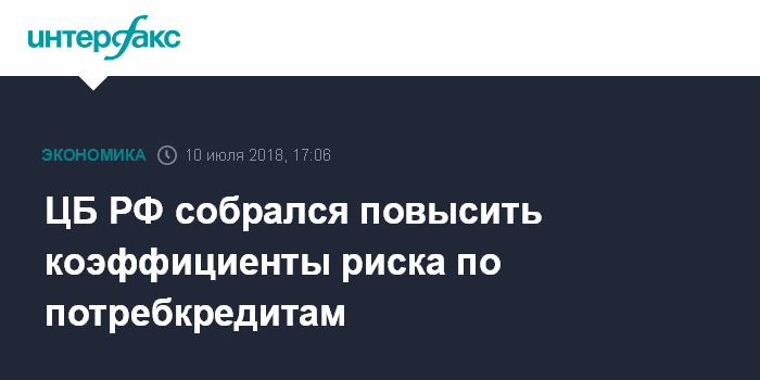 Москва. 10 июля. INTERFAX.RU - ЦБ РФ планирует повысить коэффициенты риска по потребительским кредитам, говорится в пресс-релизе регулятора.