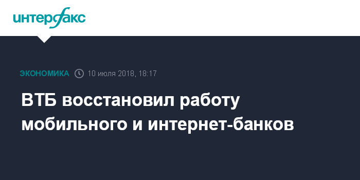Москва. 10 июля. INTERFAX.RU - ВТБ восстановил работу мобильного и интернет-банков, которые несколько часов функционировали с ограничениями.