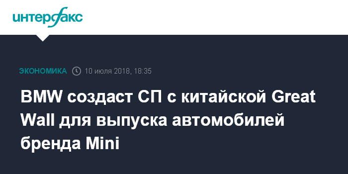Москва. 10 июля. INTERFAX.RU - Германский производитель автомобилей класса "люкс" BMW AG создаст совместное предприятие с китайской Great Wall для выпуска автомобилей бренда Mini, сообщает агентство Bloomberg.