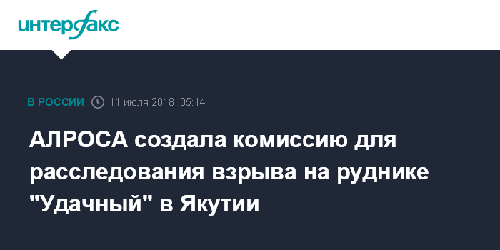 Москва. 11 июля. INTERFAX.RU - Создана комиссия по расследованию взрыва на подземном руднике "Удачный", где погиб рабочий, сообщили агентству "Интерфакс " в пресс-службе компании "АЛРОСА" в среду.
