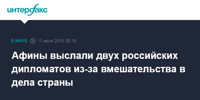 Москва. 11 июля. INTERFAX.RU - Греческие власти решили выслать двух российских дипломатов, еще двум запрещен въезд, их обвинили во вмешательстве во внутренние дела страны и вопросы национальной безопасности греческого государства, сообщила в среду газета "Катимерини".