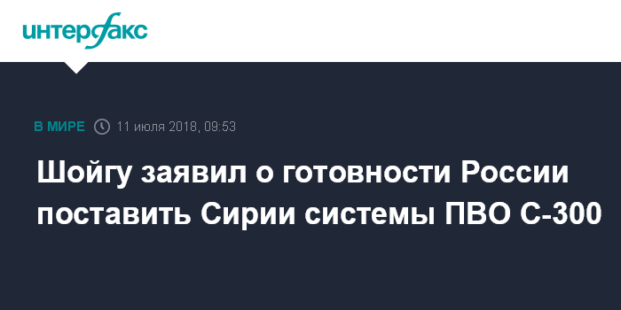 Москва. 11 июля. INTERFAX.RU - Россия готова вернуться к вопросу поставки систем ПВО С-300 Сирии, но обращения от Дамаска пока нет, сообщил министр обороны РФ Сергей Шойгу.