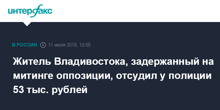Москва. 11 июля. INTERFAX.RU - Приморский краевой суд взыскал с органов МВД в пользу жителя Владивостока 53 тысячи рублей за незаконное задержание на антикоррупционном митинге, организованном сторонниками оппозиционера Алексея Навального 12 июня прошлого года.