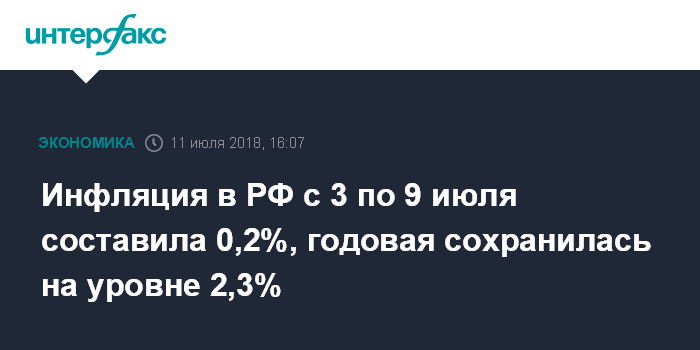 Среднесуточный рост цен за 9 дней июля равнялся 0,036%. За аналогичный период июля 2017 года среднесуточный прирост равнялся 0,038%. Из этих данных следует, что годовая инфляция к 9 июля осталась на уровне конца июня и составила 2,3%.