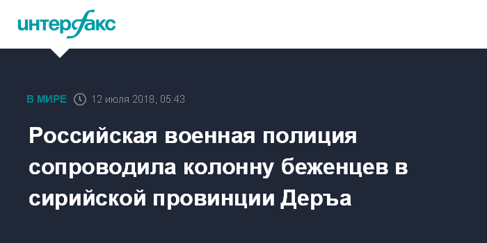 Москва. 12 июля. INTERFAX.RU - Российские военные сопроводили очередную колонну беженцев из Босры-Эш-Шам в освобожденный от боевиков населенный пункт Эн-Найм в провинции Деръа, сообщили в российском центре примирения.