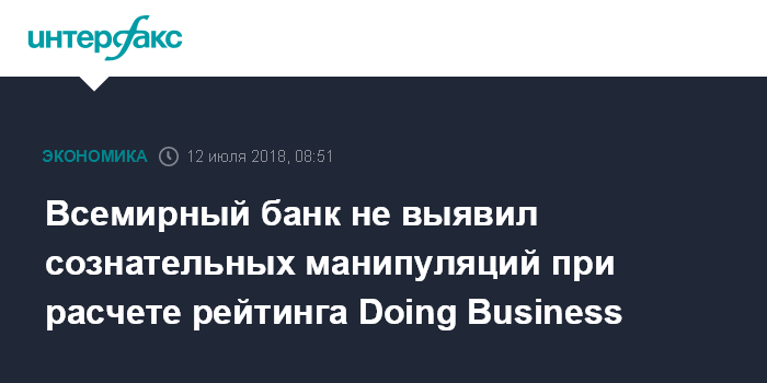 Москва. 12 июля. INTERFAX.RU - Методика рейтинга Doing Business, который оценивает условия ведения бизнеса в странах мира, не подвергалась манипулированию в политических целях, показал проведенный Всемирным банком внешний аудит.