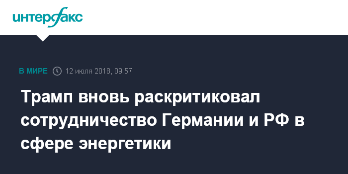 Москва. 12 июля. INTERFAX.RU - Президент США Дональд Трамп в четверг вновь подверг критике соглашение между Германией и Россией в сфере энергетики.