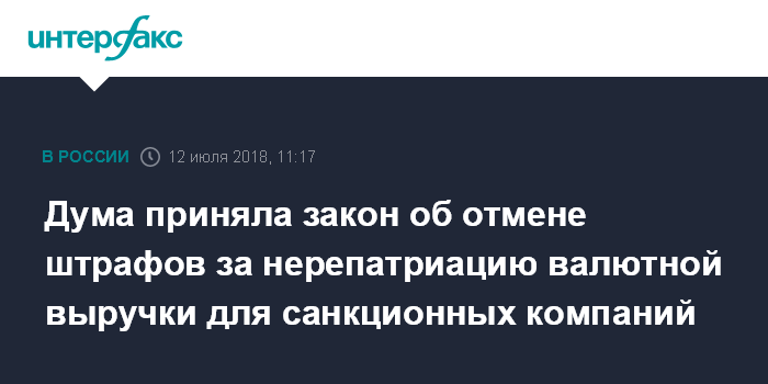 Москва. 12 июля. INTERFAX.RU - Госдума в четверг приняла в третьем, окончательном, чтении поправки в закон о валютном регулировании, которые отменяют штрафы за нерепатриацию валютной выручки для компаний-экспортеров, которые подпали под западные санкции.