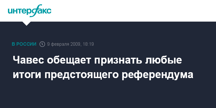 Чавес добавил, что признает результаты референдума, который должен состояться в воскресенье, даже в случае проигрыша, и призвал оппозицию сделать то же самое. "Я хотел бы услышать то же самое от руководителей оппозиции. Мы признаем результаты референдума и продолжим идти вперед. Это мой призыв и мое решение", - сказал Чавес.