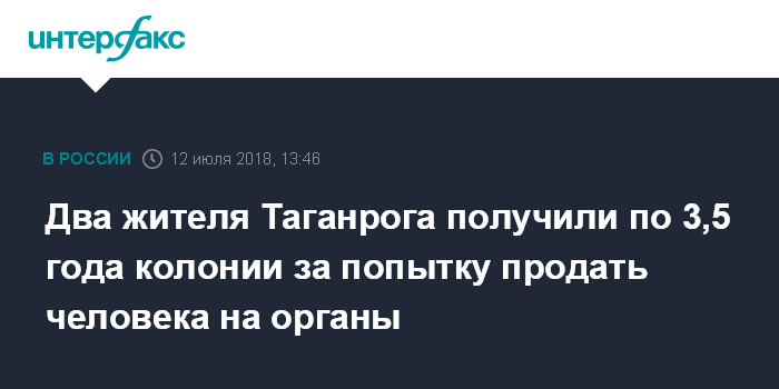 Москва. 12 июля. INTERFAX.RU - Таганрогский городской суд Ростовской области вынес обвинительный приговор в отношении местных жителей Андрея Кочубея и Дмитрия Шеховцова, которые пытались продать своего знакомого на органы, сообщает пресс-служба суда.