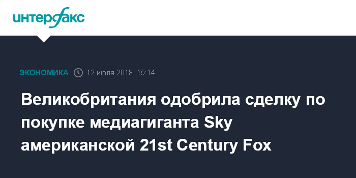 Москва. 12 июля. INTERFAX.RU - Британские власти не намерены препятствовать сделке по покупке американской компанией 21st Century Fox европейского телевизионного гиганта Sky Plc. Министерство цифровых технологий, культуры, СМИ и спорта Великобритании одобрило эту сделку, говорится в пресс-релизе Fox.